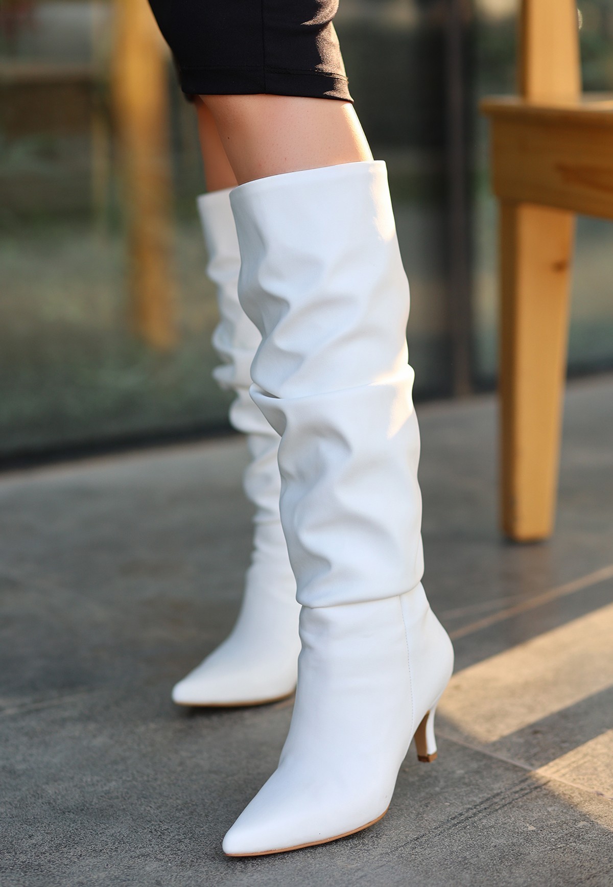 Çizme Zelya Beyaz Cilt Topuklu Çizme
